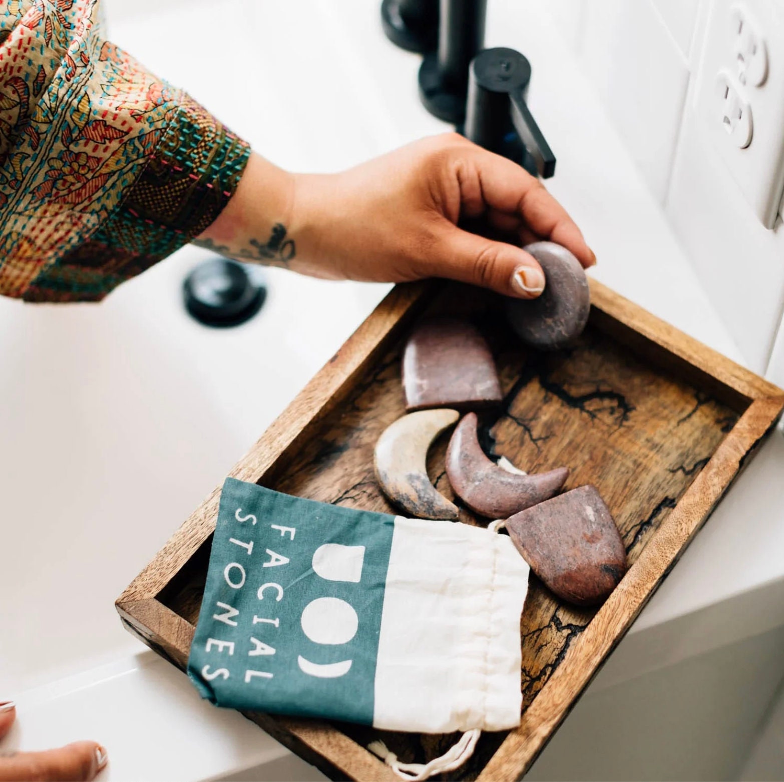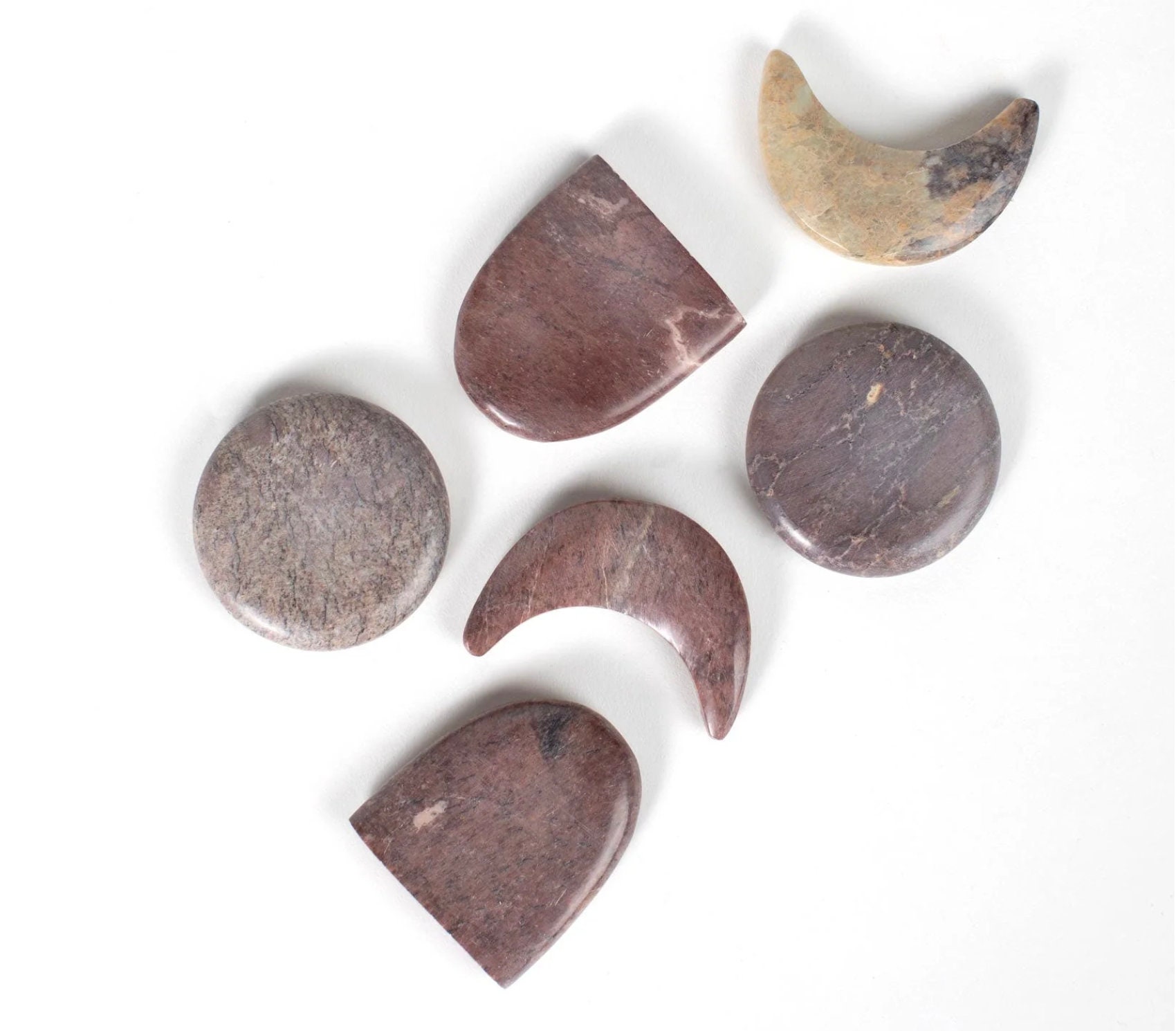 Use this set of Palewa Massage Stones in your self-care routine to release tension and help to Give the gift of a face massage! This set of six face massage stones is handcrafted by artisans working with Tara Projects. The stones come bundled in a drawstring bag, making this set a lovely wellness gift.