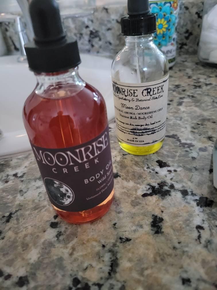 This beautifully aromatic oil blend nourishes heals, and protects, while taking your senses on a journey through a meadow of wild flowers. Let these luxurious botanical oils work their plant magic from head to toe. Best results if used after with our Wild Spirit Body Scrub. The scarlet color of this oil is derived from Alkanet Root & Elder Berries, there are no artificial colorants in our products. (An excellent massage oil)